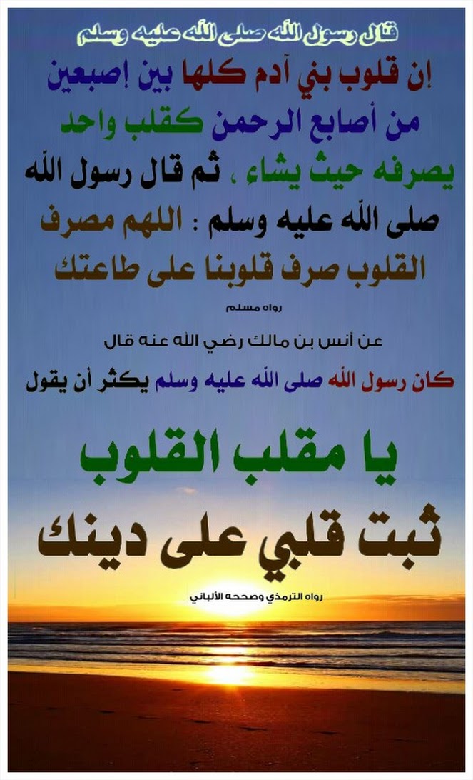 قال رسول الله: «إن قلوب بني آدم كلها بين أصبعين من أصابع الرحمن كقلب واحد يصرفه حيث يشاء ثم قال رسول الله صلى الله عليه وسلم: اللهم مصرف القلوب صرف قلوبنا على طاعتك» رواه مسلم