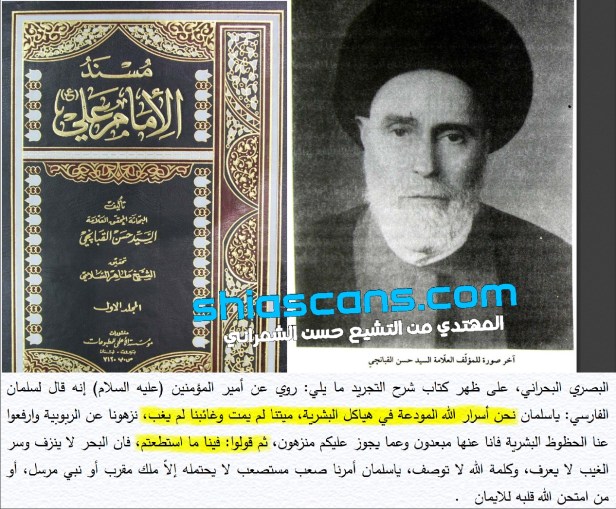 ‘It is narrated on the authority of the Chief of the Believers (‘Ali) that he said to Salman the Persian (al-Farisi): “O Salman! We (the Ahl al-Bayt) are the treasured godly secrets in human form, our dead are not dead and our absent ones are not absent. Declare us (Ahl al-Bayt) pure and free of al-Rububiyyah (lordship) and the fortunes (mistakes) of mankind for were are free of it and from what (of mistakes) you commit. After that, say whatever you can about us for the sea does not bleed and the secret of the unkown cannot be uncovered and the speech of Allah cannot be described. O Salman! Our affair is difficult and made difficult, nobody can bear it except an archangel, a Messenger of Allah or someone whose heart has been tested by Allah with Iman (faith).”