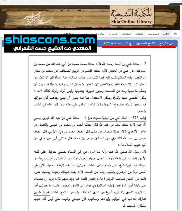 قال رسول الله صلى الله عليه وآله لما اسرى بي إلى السماء حملني جبرئيل على كتفه الأيمن فنظرت إلى بقعة بأرض الجبل حمراء أحسن لونا من الزعفران وأطيب ريحا من المسك فإذا فيها شيخ على رأسه برنس، فقلت لجبرئيل: ما هذه البقعة الحمراء التي هي أحسن لونا من الزعفران وأطيب ريحا من المسك قال: بقعة شيعتك وشيعة وصيك على، فقلت من الشيخ صاحب البرنس؟ قال: إبليس قلت: فما يريد منهم قال: يريد ان يصدهم على ولاية أمير المؤمنين (عليه السلام) ويدعوهم إلى الفسق الفجور، فقلت: يا جبرئيل أهو بنا إليهم، فاهوى بنا إليهم أسرع من البرق الخاطف والبصر اللامع، فقلت: قم يا ملعون فشارك أعدائهم في أموالهم وأولادهم ونسائهم، فان شيعتي وشيعة علي ليس لك عليهم سلطان، فسميت قم.(علل الشرائع – “الصدوق” – ج ٢ – الصفحة ٥٧٢)Imam al-Sadiq said that his forefathers narrated to him that the Prophet (s) said: ‘When I ascended to the heavens, Jibreel carried me on his right shoulder, so I looked at a spot of land, a red mountain better in colour than saffron and with a better scent than musk. There was an old man with a hooded cloak upon his head. So I said to Jibreel: ‘What is this red spot which is more beautiful in colour than saffron and has a better scent than musk?’ He said: ‘A spot of your Shi’ites and Shi’ites of your legatee Ali.’ I asked: ‘Who is the old man with the hooded cloak?’ He said: ‘Iblis.’ I said: ‘So what does he want from them (Shi’ites)?’ He wants to repel them from the the Wilayah of the prince of the believers (Ali) and invite them mischief and immorality’. I said: ‘O Jibreel! Let us go to him.’ So he took me to him quicker than the speed of light. I said to him (Iblis): ‘Arise (qum), O cursed one! Join their (Shi’ites) enemies in their wealth, and their children, and their womenfolk, but as for my Shia, and the Shia of Alia, there is no authority for you over them’. (‘Ilal al-Shara’i by al-Saduq, chapter 131 and Bihar al-Anwar by al-Majlisi, vol. 57, pg, 218)