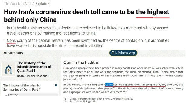 Comment: Good worship like tomb/grave/shrine worship, annual forms of extreme mourning rituals and self-flagellation, ritualised cursing of the Sahabah or what about the bid’ah and sanctified (by ‘Ayatollahs’) wishing well in Jamkaran, Qum (and elswhere in Iran!) where the ‘devout believers’ write letters (!) to their hidden Imams (just like Jews do, just worse, as Jews address God directly and alone!) asking him for all their needs. As for calamities…then the people of Qum (‘the safe haven for the faithful’) has been hit by the Coronavirus more than any other region of Iran and the entire middle east.