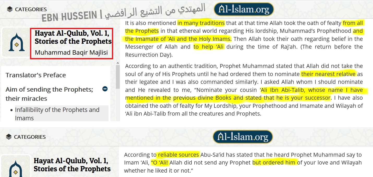 It is also mentioned in many traditions that at that time Allah took the oath of fealty from all the Prophets in that ethereal world regarding His lordship, Muhammad’s Prophethood and the Imamate of ‘Ali and the Holy Imams. Then Allah took their oath regarding belief in the Messenger of Allah and to help ‘Ali during the time of Raj‘ah. (Hayat al-Qulub by MB Majlisi)