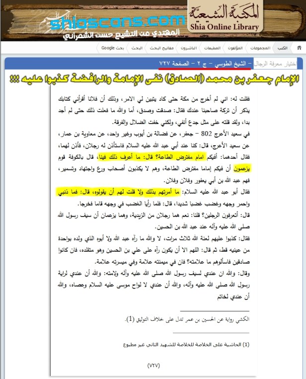 Jafar ibn Muhammad (al-Sadiq) was asked: “Is there any amongst you Ahlul-Bayt whose obedience is obligatory, and will those who are ignorant of this die the death of Jahiliyyah?” He (i.e. al-Sadiq) said, “No by Allah, none of us says such a thing, and whoever says such a thing about us is a liar.” I then said to Umar ibn Ali: “May Allah have mercy upon you, they (i.e. Rafidah) claim that the Prophet () designated Ali as his successor and Ali designated al-Hasan and al-Hasan designated al-Husayn and al-Husayn designated his son Ali ibn al-Husayn and Ali ibn al-Husayn designated his son Muhammad ibn Ali.” He (i.e. Umar ibn Ali) said, “By Allah, my father (i.e. Ali ibn Abi Talib) did not designate anybody. What is wrong with them (i.e. Rafidah)? may Allah destroy them! These people enrich themsleves misusing our names. This Khunays* and that Khunays…” I said, “You mean al-Mu’alla ibn Khunays?” He said: “Yes, al-Mu’alla ibn Khunays. By Allah, I have been contemplating deeply, and I wonder about a people whose minds are so clouded by Allah Almighty that a person like al-Mu’alla ibn Khunays has led them astray.” (Juz ibn Asim al-Thaqafi al-Asbahani, p. 124 with a sahih chain of narration)