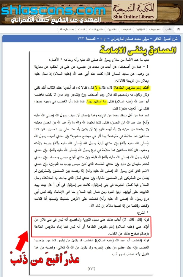 “His (al-Sadiq’s) statement of ‘no’ (rejection of Imamah) was by way of Tawriyah (to say something intending other than what is normally understood from it) and what is meant is that in such and such clan from the descendants of Ali () there is no Imam whose obedience has been imposed as a duty by Allah or that there is no Imam whose obedience has been imposed as a duty by Allah according to you (questioners i.e. the Zaydis). This is how he (al-Sadiq) avoided lying.” (Sharh Usul al-Kafi by Muhammad Salih al-Mazandarani, vol. 5, pg. 323)